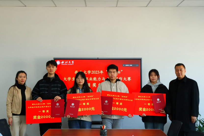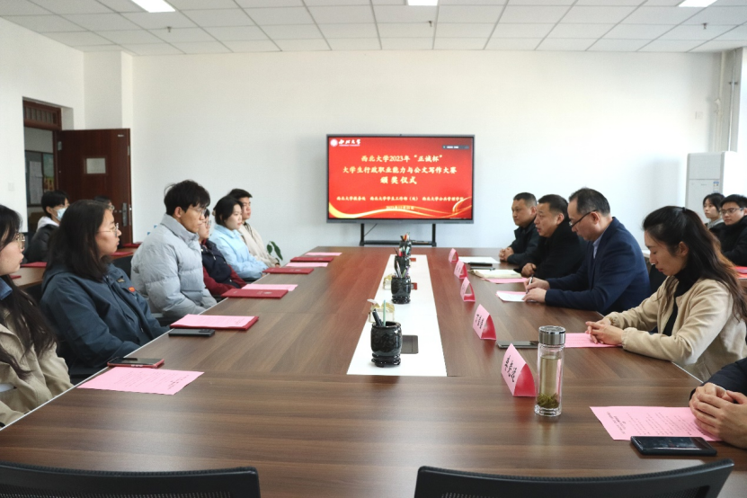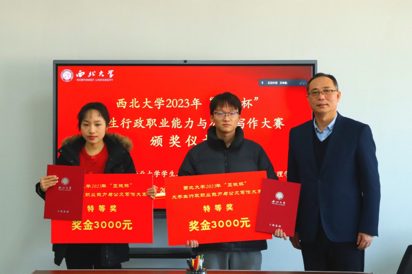 12月21日下午,西北大学2023年“正诚杯”大学生行政职业能力与公文写作大赛颁奖仪式在565net必赢13层中型会议室召开。学校教务处副处长李力,学生就业创业服务中心常务副主任丁莹莹,565net必赢2004级人力资源管理专业校友、正诚集团董事长杨寿海,565net必赢党委书记窦争光,党委副书记韩杰,副院长李尧远,以及获奖的同学们参加了仪式。颁奖仪式由韩杰主持。