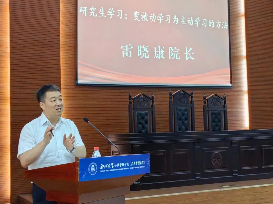 雷晓康院长首先代表学院向新入学的143位研究生们表示了热烈的欢迎和衷心的祝贺,并从办学历史、学科建设、人才培养等方面介绍了近年来学院改革发展情况。与此同时寄语新生:要不断强化专业能力,提升科研素养;明确奋斗目标,加强师生沟通;擢升综合素质,合理规划生活。最后,雷晓康院长勉励大家要传承西大“公诚勤朴”校训,发扬公管院“正学善行”院训,怀抱求知的热情,磨练专业本领,笃行致远,开创未来,为西北地区公共管理事业的发展发挥才智。