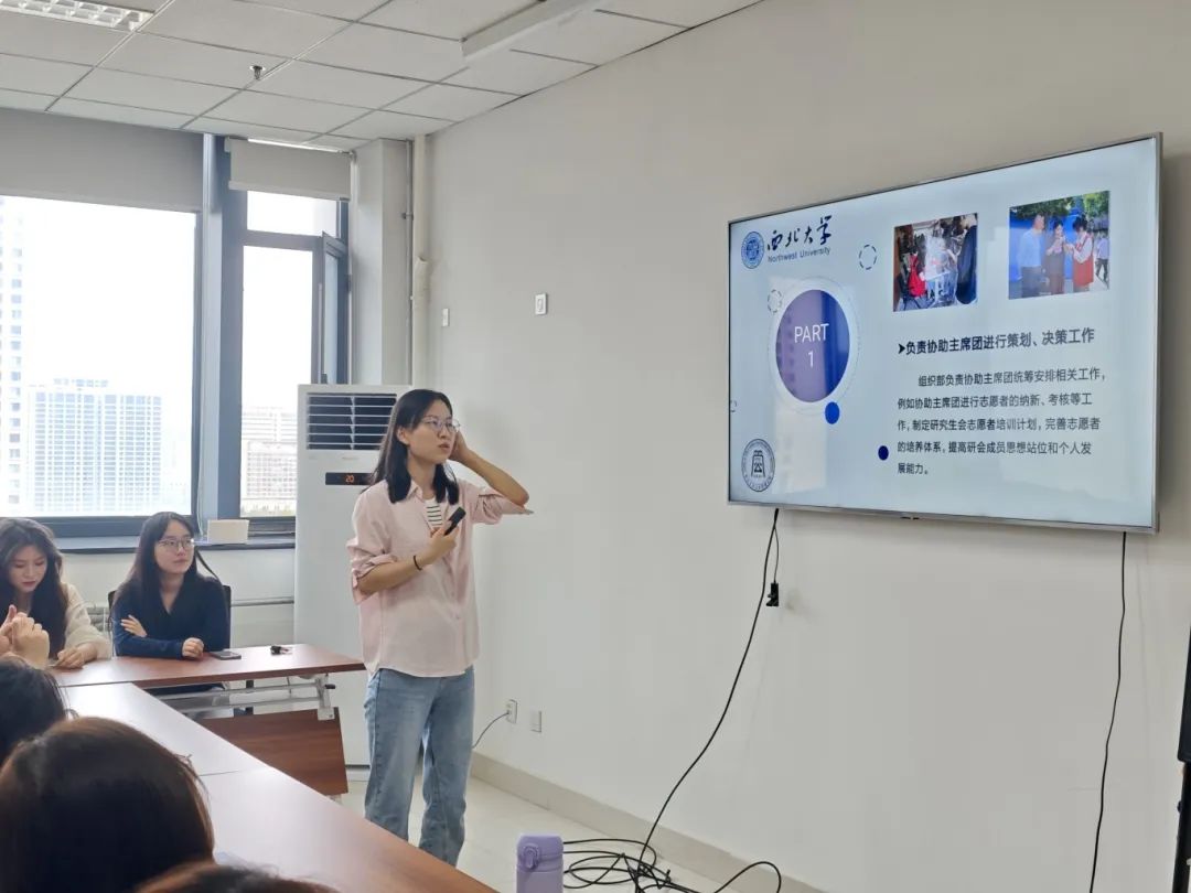会议伊始,研会主席团成员王思齐对研会工作以及各部门负责人进行简要介绍,重点对本学期研究生会组织建设、实践活动等各项工作进行进一步说明。研会全体成员认真聆听学姐介绍,对研会有了更深一步的认识。