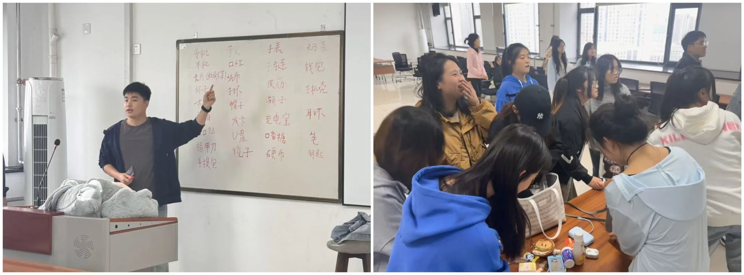 在进一步熟悉彼此之后,接下来进行的“蒙眼喂食”和“七拼八凑”两个游戏都是需要团队协作共同完成的。在“蒙眼喂食”中同学们两两组队,戴眼罩的同学需要跨过层层干扰将食物递给自己的搭档,而“七拼八凑”则是需要6人一组凑齐白板上所写的物品。这两个游戏通过团队任务使同学们由彼此初识到合作默契,增进交流,培养信任。