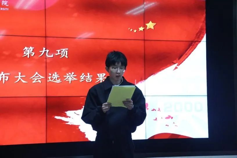 院研究生会主席团成员孟英婷致闭幕词。孟英婷同学首先对新一届学生会主席团、研究生会主席团的成功当选表示祝贺,对上一届的学生会和研究生会的工作和贡献进行肯定。鼓励新一届院学生会、研究生会“在新时代新征程中挺膺担当,奋发有为:在学生思想政治引领中当引导者、在服务同学成长成才中当实干家、在学院事业发展中当生力军、在全面加强自身建设中争当表率”。