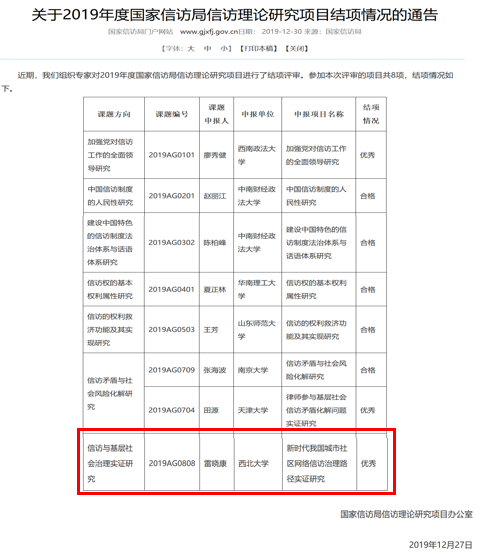 基地主任雷晓康教授团队承担的国家信访局2019年项目结项获“优秀”