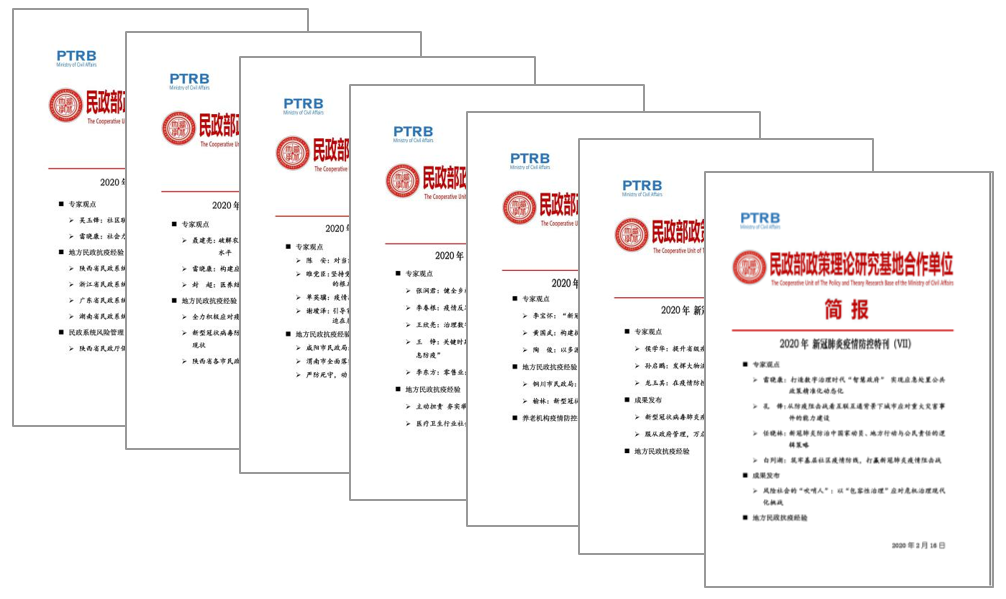 为深入贯彻落实习近平总书记有关新冠肺炎疫情防控工作的重要讲话和重要指示精神,认真响应国家与省市疫情防控工作的决策,基地充分发挥学科优势,积极开展疫情防控相关领域的研究工作,征集专家观点与民政服务机构疫情防控的经验措施,于2020年2月5日至2月16日共推出7期疫情防控特刊,为政府决策制定和民政服务机构疫情防控提供了强有力的支持。