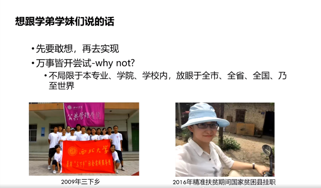 现在香港岭南大学任助理教授的石琤学姐从自己的个人履历讲起,谈到她从西大社保本科毕业后保送到人大读研,工作两年后开始读博,再出国留学,做博士后,她感恩西大社保专业带给她成长道路上的每一点进步以及科研上的起步,谈到西大社保专业开的课程很丰富,很受用,专业实习也很有用。在分享中,石琤学姐提到她在读书时,看到身边很多同学朋友已经工作几年实现经济独立的心理落差,学姐向同学们分析了直接读博和先工作后读博的利弊,让在校生们感触多多的同时也启发多多,最后学姐也给同学们留下寄语,让同学们不要太计较当下的得失(特别是失),也勉励同学们“天下没有免费的功夫,所有付出都有回报;此处不开花,自有花开处”。