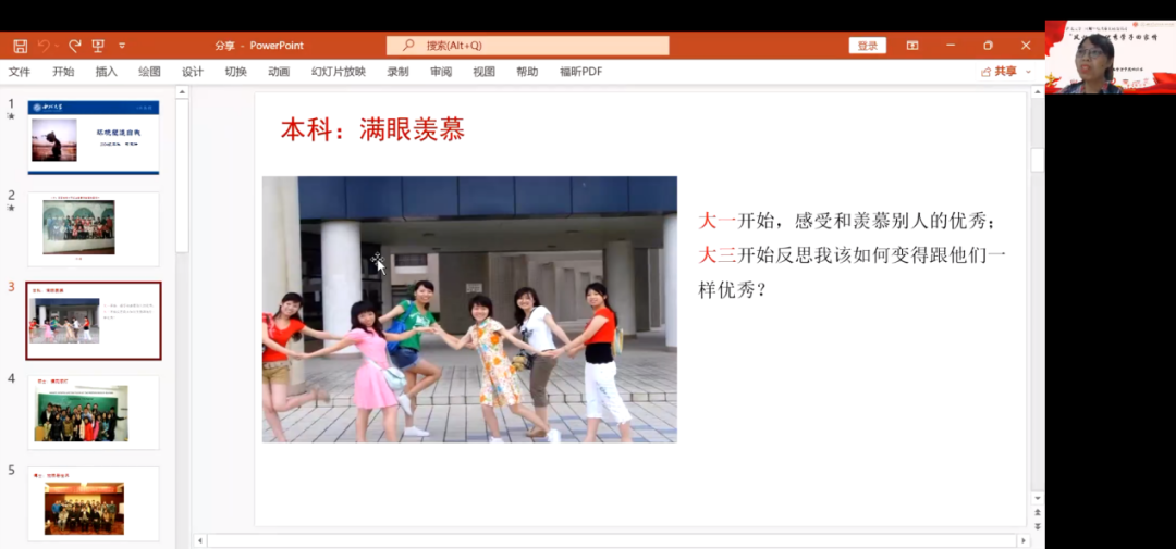 王昭茜学姐是此次座谈分享的唯一一位还在校读书的嘉宾,昭茜学姐的分享更加贴近在校生的校园学习生活,学姐幽默风趣的为大家分享了她对校园“卷”文化以及校园生活的期待与落差的诸多心得,为大家分享了她求学这几年中“卷”出来的经验和感悟,最后期望大家在校期间一定要找准目标、活出精彩!