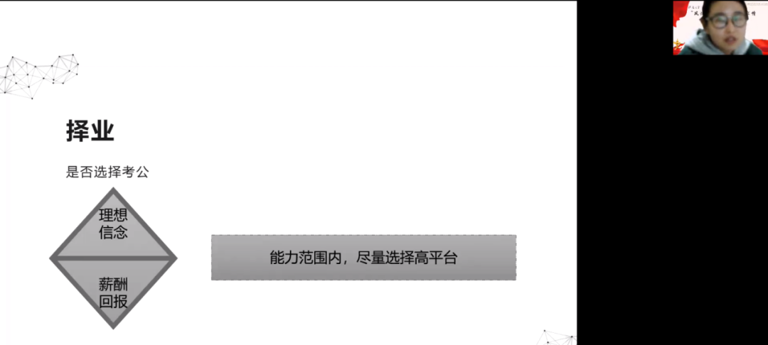 在考公方面,目前在政府工作的13级研究生武金岐学姐将自己丰富的考公考编经验为大家作了分享,将考公考编的很多干货一一道来,同时金岐学姐也给在校同学们在择业上给予了很多建议,告诫大家在研究生期间要积极培养自己的逻辑思维和综合素质,在选择报考岗位以及备考过程中一定要充分认识自己的能力以及尽最大的努力去准备,最后勉励大家“年轻不要偷懒,做自己世界里发光的星体”。