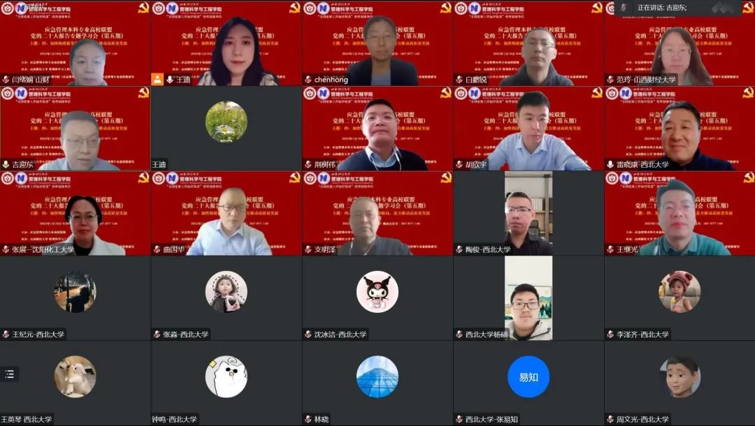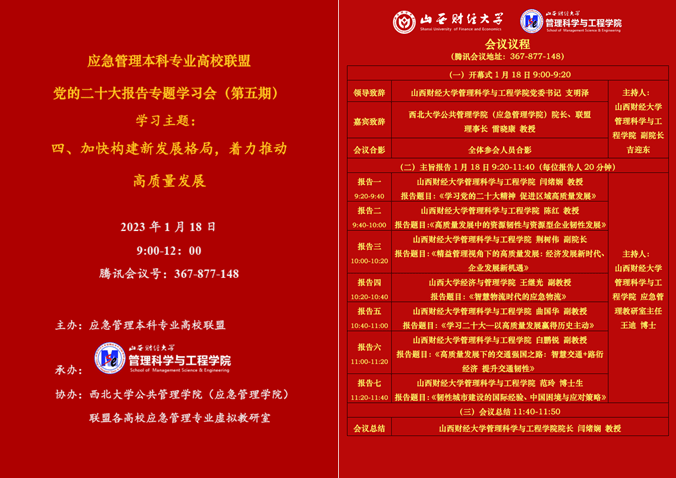 2023年1月18日上午,由应急管理本科专业高校联盟主办,山西财经大学管理科学与工程学院承办,565net必赢客户端、联盟各高校应急管理专业虚拟教研室协办的党的二十大报告专题学习会(第五期)成功召开。与会人员围绕“加快构建新发展格局,着力推动高质量发展”这一主题认真学习研讨,来自西北大学、中国地质大学、中国矿业大学、沈阳化工大学、武汉理工大学、河南理工大学、山西大学等应急管理本科专业高校联盟各个院校的师生和专家学者参加了学习会。