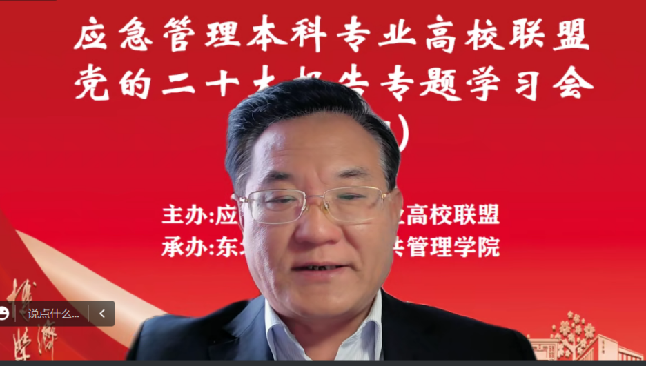 东北财经大学党委常委、副校长王维国教授在开幕式上致辞,感谢来自全国各地的应急管理专家学者长期以来对于东北财经大学应急管理学科建设和发展的大力支持。王校长指出,新一代智能技术已成为重塑高等教育的形态的新动能,以实体教研室为基础,融合开放互联、虚实融通、资源共享特点的虚拟教研室是适应信息化时代推进高等教育高质量发展的重要探索和实践,是信息化时代新型基层教学组织建设的重要探索。应急管理作为一门蓬勃发展的新学科,需要构建中国自主知识体系的应急管理学科基本范式、核心概念和框架体系,进一步完善自然灾害、工程技术、生产运作、经济金融、信息安全、社会治理等细分领域的知识结构和学科体系,探讨新时代应急管理学科的人才培养规律和教育体系。东北财经大学承办应急管理本科专业高校联盟党的二十大报告专题学习会,将有力地推进该校应急管理学科在人才培养、科学研究和服务社会等领域与全国同行开展广泛的交流合作。