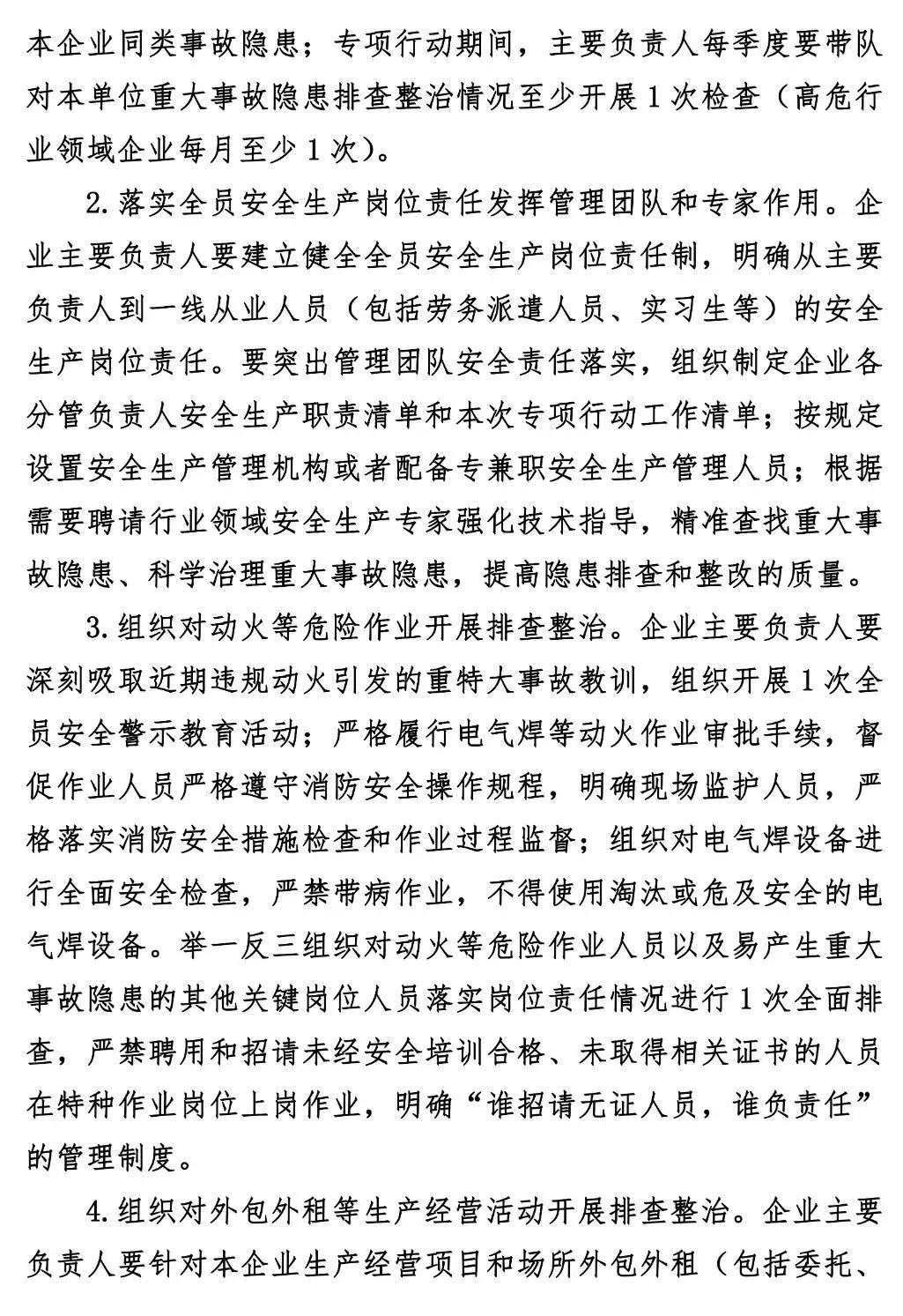 《方案》紧紧围绕“切实提高风险隐患排查整改质量、切实提升发现问题和解决问题的强烈意愿和能力水平”狠下功夫,突出煤矿、非煤矿山、危险化学品、交通运输(含道路、铁路、民航、水上交通运输)、建筑施工(含隧道施工)、消防、燃气、渔业船舶、工贸等重点行业领域,兼顾新业态新领域,聚焦可能导致群死群伤的重大事故隐患,特别是近年来重特大事故暴露出的违规动火、外包外租管理混乱、不开展应急演练、员工不熟悉逃生出口等突出问题深入开展专项排查整治行动,聚焦企业主要负责人第一责任带动全员安全生产岗位责任落实,精准严格执法,务求排查整治取得实效。