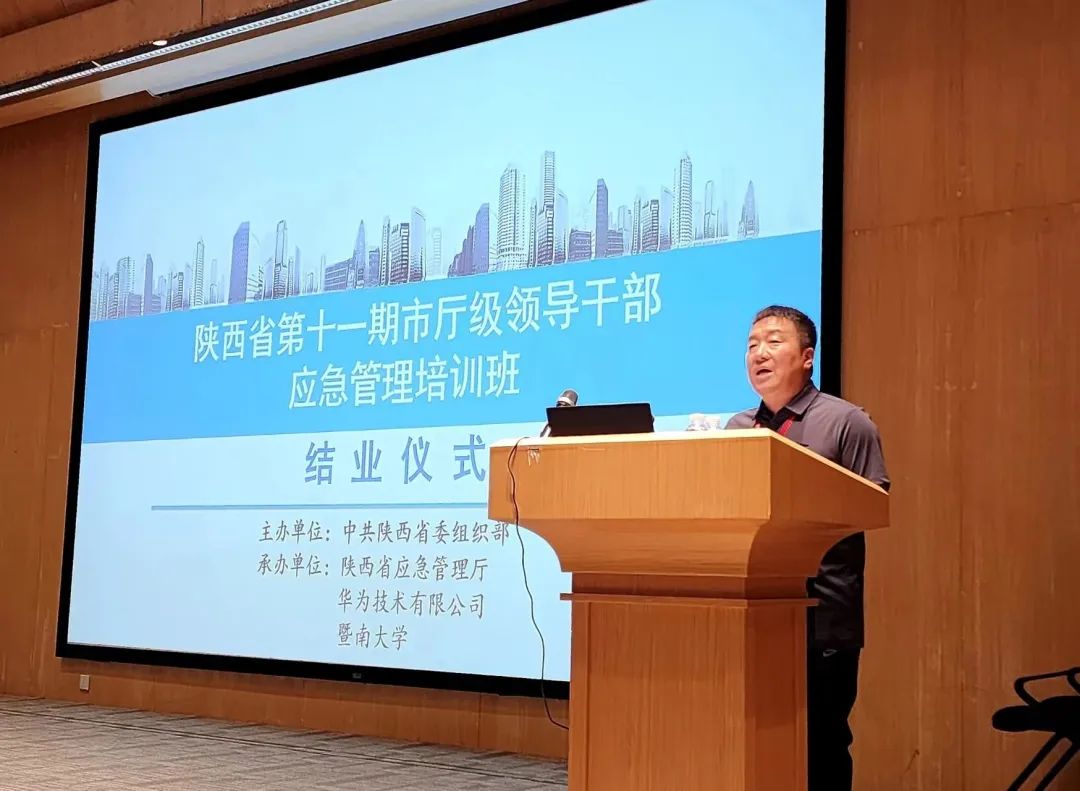 2023年4月23日至27日,由陕西省委组织部主办,陕西省应急管理厅承办,暨南大学和华为培训基地协办的陕西省第十一期市厅级领导干部应急管理培训班在深圳市正式开班。此次培训通过主题报告、专题讲座、现场教学等形式,深入学习贯彻党的二十大精神,贯彻落实习近平总书记关于应急管理重要论述和来陕考察重要讲话重要指示精神,提升统筹发展和安全、完善公共安全体系、处置重大突发灾害事故的决策指挥能力,加强灾害事故救援处置协同作战能力,提升领导干部防范化解重大风险和科学应对处置能力。