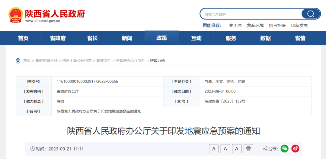 《陕西省地震应急预案》已经省政府同意,现印发给你们,请认真贯彻执行。2011年5月19日经省政府批准、由省政府办公厅印发的《陕西省地震应急预案》同时废止。