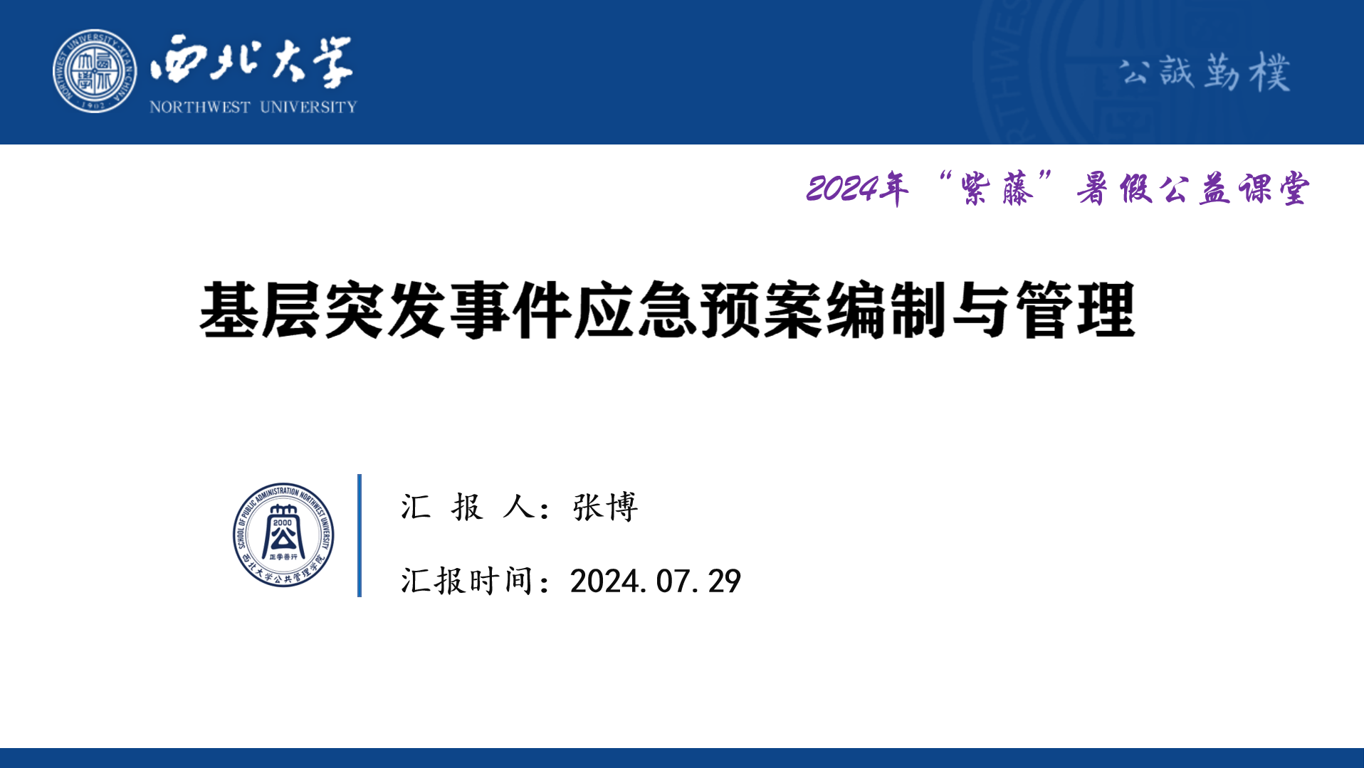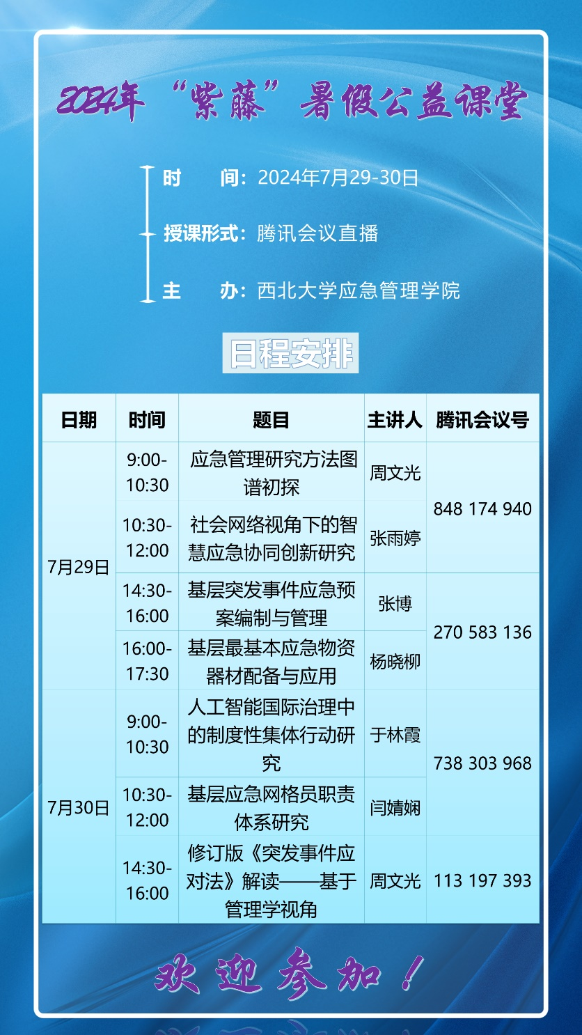 2024年7月29日到30日,由西北大学应急管理学院主办的“紫藤”暑期公益课堂在线举行,累计200多人次参加学习。暑期公益课堂是西北大学应急管理学院2020年成立以来非常重视的一项公益工作,从今年起,正式命名为“紫藤”暑期公益课堂。“紫藤”寓意为:为爱而办,为情而聚。