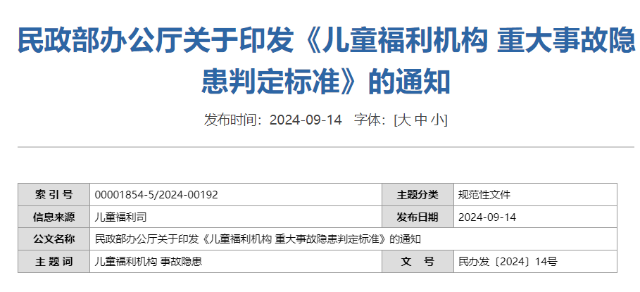 应急政策|民政部办公厅关于印发《儿童福利机构重大事故隐患判定标准》的通知