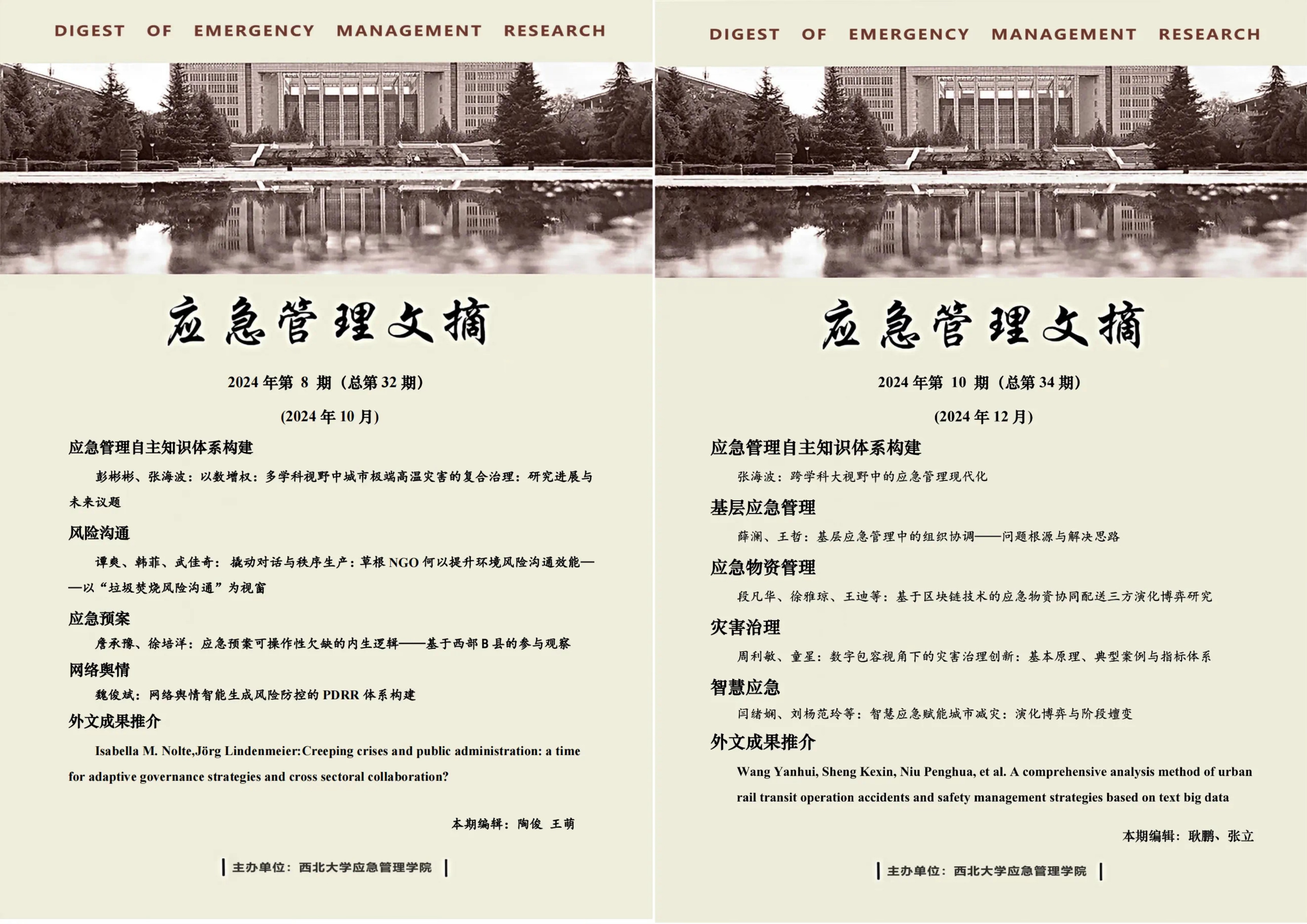 2024年,西大应急开辟了下载专区,以便学界和行业同仁下载、交流和使用。由应急管理本科专业高校联盟(虚拟会议型联盟&学术共同体)倡议、西北大学应急管理学院主办的《应急管理文摘》共推出34期。其中,2024年已先后推出10期。从2021年10月开始,每月推出一期《应急管理文摘》,选取应急管理研究的最新文献编辑成册,并根据涉及的领域和范围,每期将设立不同栏目进行整理归类,通过高质量的新刊论文与应急管理学者们对话,共同探讨应急管理的基本原理、内在规律、理论创新和实践探索。