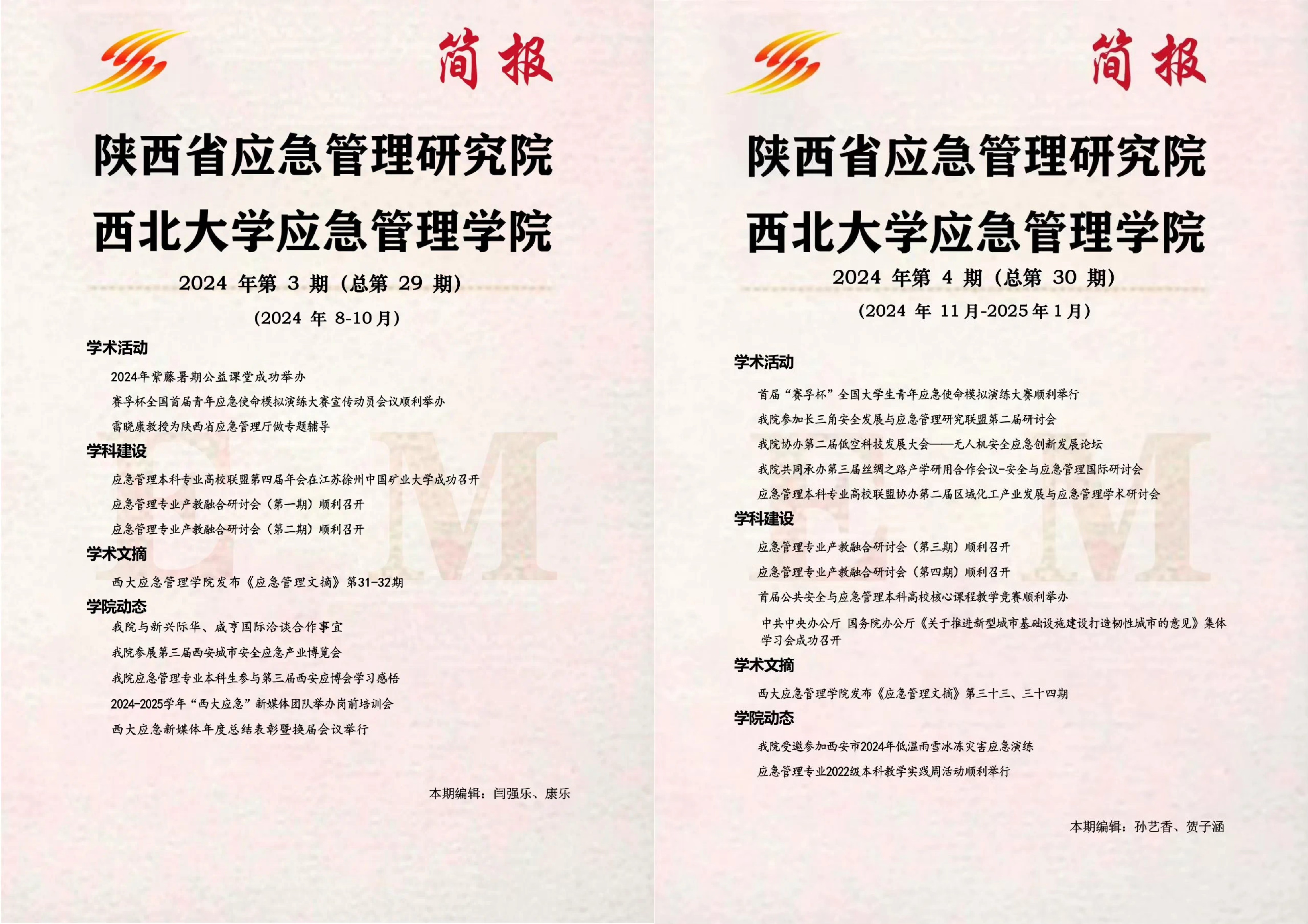 由西北大学应急管理学院主办的《应急管理简报》已推出30期。其中,2024年共推出4期,每一期《应急管理简报》都会从学术活动、学科建设、学术文摘、学院动态等多个维度总结复盘一定时间段内应急管理团队的工作情况。