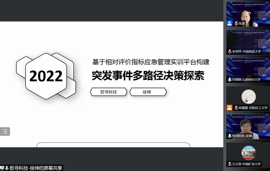 上海哲寻信息科技有限公司的徐坤副总经理做了题为《突发事件多路径决策探索——基于相对评价指标应急管理实训平台构建》的报告。上海哲寻信息科技有限公司是中国领先的高校公共管理和健康管理模拟实践教学整体解决方案提供商,徐坤副总经理代表公司从应急划分、模糊决策、资源配置、动态相对评价、多路径五个角度逐一进行分享。他对应急进行了四横七纵的划分,认为通过模糊决策、人力物力资源配置及动态相对评价三个方面预见智慧应急的发展需要一套基于真实事件形成的沙盘推演系统,涉及监测预警、资源调配、应急处置及灾后恢复四个阶段,体现数字化、智能化、场景化,该系统形成后可不断反哺整个应用过程。