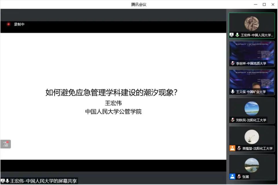 开幕式由沈阳化工大学经济与管理学院院长张展教授主持。沈阳化工大学副校长笪可宁教授首先致辞,笪可宁教授对各位嘉宾相聚云端表示热烈欢迎,介绍了沈阳化工大学的历史沿革,并立足于新时代的机遇与挑战,希望同与会各兄弟院校一道共同探索应急管理本科专业建设之路。之后,西北大学应急管理学院院长雷晓康教授代表“全国应急管理本科专业高校联盟”(虚体会议型联盟&学术共同体)作了《应急管理本科专业高校联盟一周年工作汇报》。雷院长以联盟成立历程为时间轴,从2021年应急管理本科专业人才培养方案讨论会、应急管理本科专业课程体系(建议)、虚拟教研室建设、应急管理本科专业推荐阅读书目、入选首批全国急救教育试点学校、2022年应急管理人才培养研讨会、搭建平台:媒体运营矩阵“一号两刊”、躬身入局贡献智库力量、联盟教师专著书籍库等多维度系统、全面地复盘应急管理本科专业高校联盟成立一年以来的工作进展和取得的丰硕成果。最后,雷院长对联盟未来开展“应急管理嘉年华”工作进行了展望,希望通过进一步激励联盟高校共建共治共享,以本科生应急管理知识大赛、案例大赛、专业课程教学研究班、应急管理专业本科生夏令营、《应急管理文摘》等丰富多样的活动形式进一步提高应急人才培养质量,推进应急管理学科高质量发展。