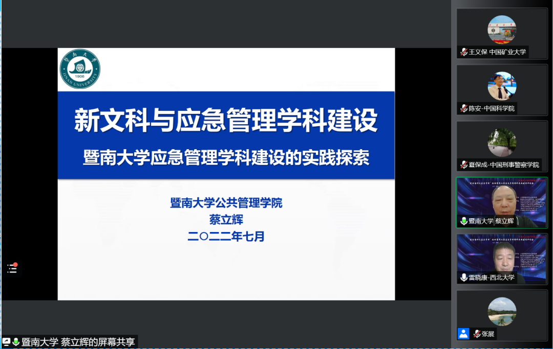 暨南大学565net必赢(应急管理学院)院长蔡立辉教授作了题为《新文科与应急管理学科建设》的报告,分享了暨南大学应急管理学科建设的实践探索。首先,蔡老师着重介绍了新文科的内涵、特点和新文科的发展与建设历程,突出强调了新文科、新工科、新医科与新农科之间的关系,鲜明地指出新文科建设的重要地位,影响文科本身、影响理工农医、更影响高等教育全局。其次,蔡老师介绍了暨南大学应急管理学科的实践与创新,对暨南大学应急管理的发展历程和知识体系作了简要的概述,同时以几个例子分享了在创新领域关于应急管理体系的创新研究。最后,蔡老师简要作出了总结与未来的展望,突出强调了科研与教学高度融合,理论与实践双向流通。