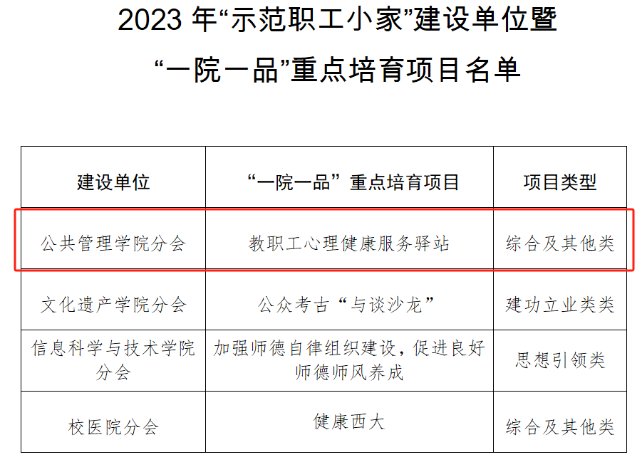 示范小家建设围绕推动学科高质量发展、创造职工高品质生活、实现学院高效能治理,努力营造“家文化”,构建“幸福家”,传承“正学善行”公管精神。一院一品项目则是本着关注职工心理健康,提升心理素养,塑造阳光心态,构筑防火墙,打造爱心港,建立共同体,搭建教职工心理健康服务平台,不仅服务于学院教职工,而且面向全校教职工,建立心理问题全过程服务体系,以回应教职工对心理健康服务的迫切需求和重要关切。